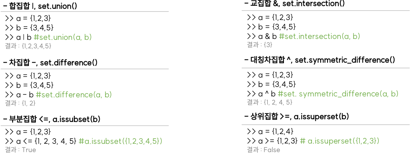 >> a.isdisjoint({3, 4, 5}) # 겹치는 요소 확인