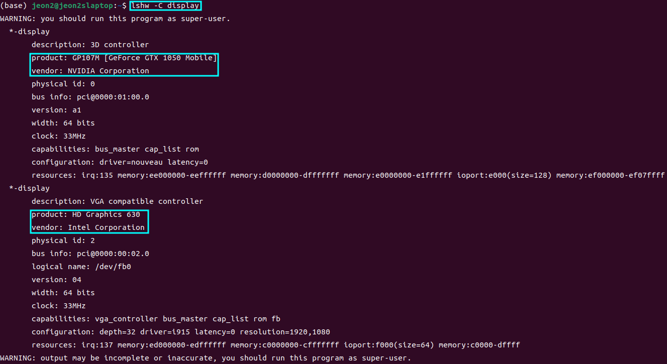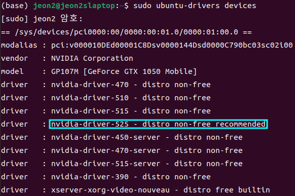 # 설치된 드라이버 검색. recommended라는 권장 드라이버를 설치/사용하자