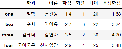 df['조정학점'] = df['학점'] * 1.2 # 연산을 통해 새로운 컬럼을 추가할 수 있음