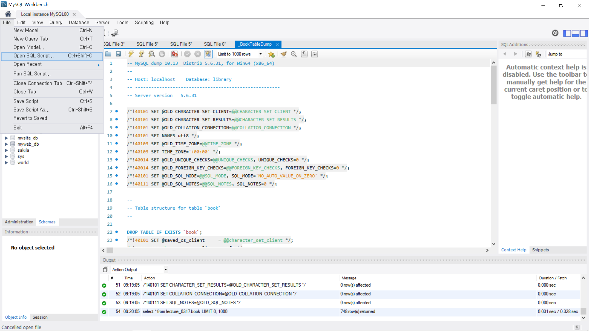1. MySQL에 새로운 schema 생성 후 메뉴에서 Open SQL Script로 DB 열기
