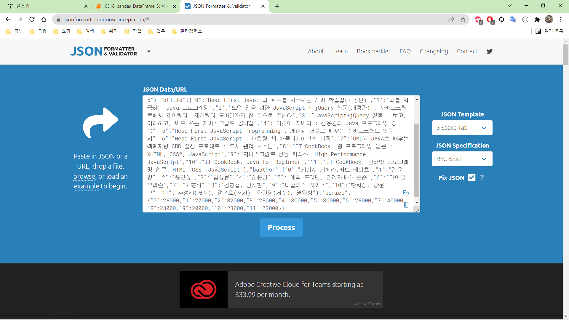 해당 경로에 생성된 JSON 파일 내용을 웹에서 JSON formatter으로 보기 좋게 JSON 파일 열어보기