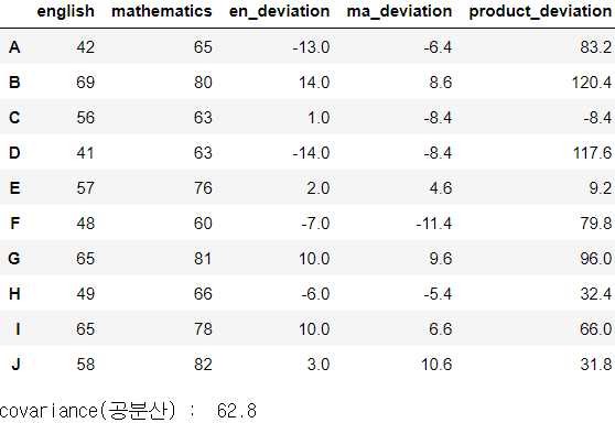 print('covariance(공분산) : ', scores_df['product_deviation'].mean()) # 62.8. 양의 상관관계