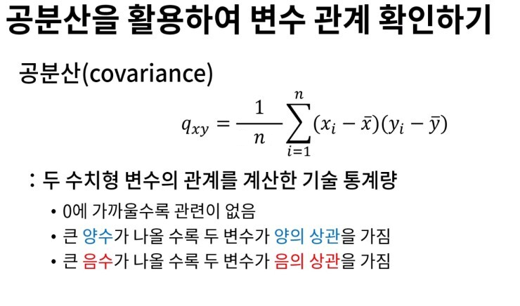 3. 변수 두 개가 서로 다른 단위일 경우 공분산 값이 달라짐 ex) 키(m, cm, mm) vs. 점수(숫자)