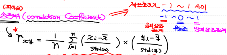 → normalization로 단위, 숫자 크기를 표준화함. 상관계수(correlation coefficient)