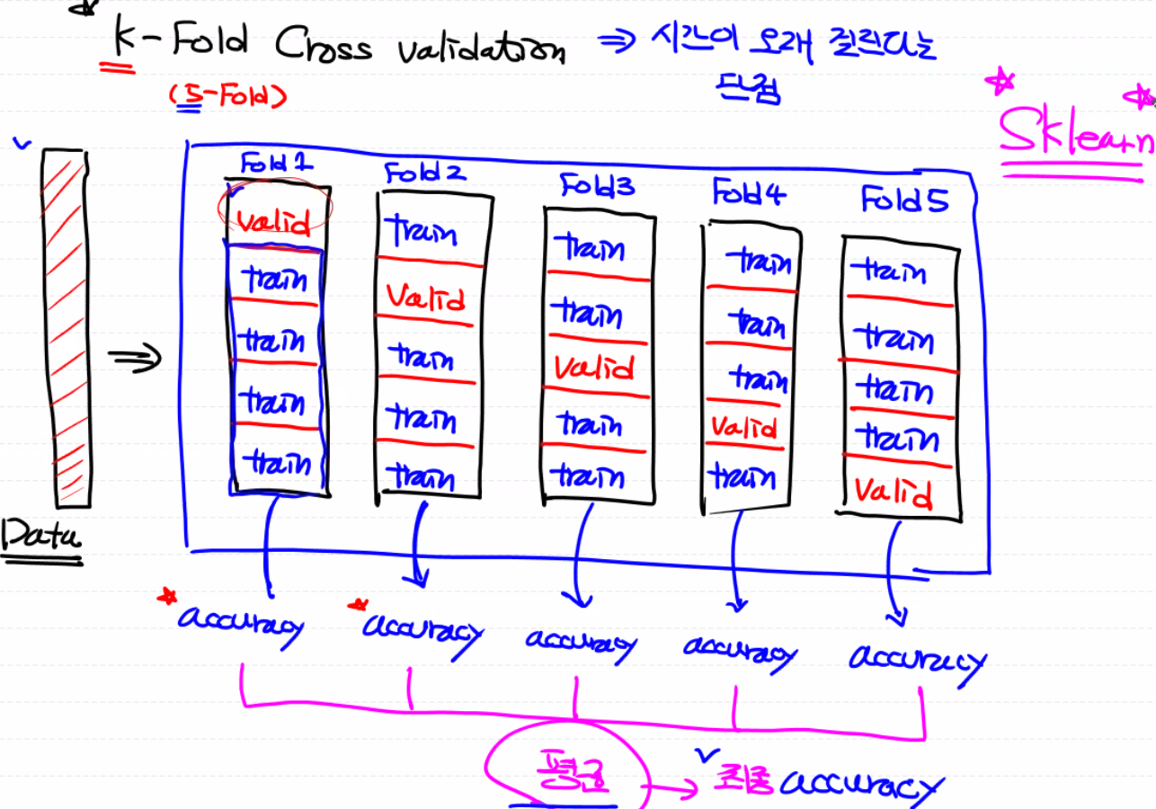 5. K-Fold Cross Validation(vs. Hold-out Validation) : Original Data Set을 Training, Validation, Test Data Set으로 나눌 때 편리성과 데이터의 비대칭을 방지하기 위해 Sklearn을 사용함. 하지만 시간이 오래 걸림