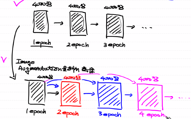 데이터셋 자체의 양이 적다면 이를 rotation, scaling 등을 적용하여(image에 noise를 주어) 개수를 늘림