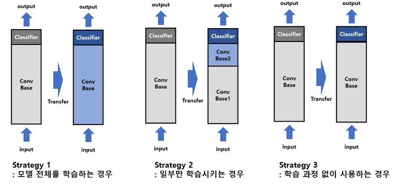 → FC layer 전의 마지막 2~3개 Conv layers의 동결을 풀고, 데이터셋에 맞게 학습이 가능한 형태로 만듦. fine tuning을 하려면, Classifier(분류기)가 전체를 동결한 CNN에 대해 학습이 되어 있어야 하므로 총 2번 학습해야 함!
