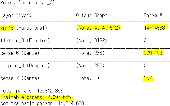 # VGG16(Conv layer) 안에 있는 모든 prams를 동결. Non-trainable params: 0 -> 14,714,688