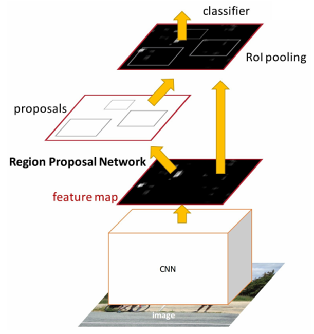 Two-Stage Detector로 유명한 R-CNN 계열은 Region Proposal Network가 오브젝트가 있을 것 같은 후보(ROI, Region Of Interest, 관심 영역. 학습 과정에서 2,000개, 테스트 과정에서는 300개의 영역)를 먼저 뽑는다. 후보로 뽑힌 ROI(영상의 작은 부분) 들은 분류기(Classification network)에 의해 클래스 분류가 이뤄지고 경계 박스(Bound Box)를 찾는다.