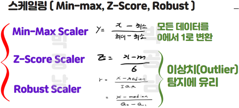 각 feature의 median(Q2)에 해당하는 데이터를 0으로 잡고, Q1, Q3 사분위수와의 IQR 차이만큼을 기준으로 정규화를 진행함. 해당 정규화 방법은 이상치에 강한 특징을 보이기에 Robust Scaler라는 이름이 붙었으며, 이상치가 많은 데이터를 다루는 경우 유용한 정규화 방법이 될 수 있음