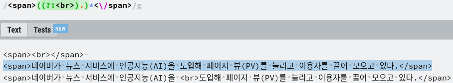 - 표현식 : <span>((?!<br>).)*<\/span> # span 태그 안에 <br> 태그를 가지지 않은 모든 문자(없는 것도 포함)를 가져오기