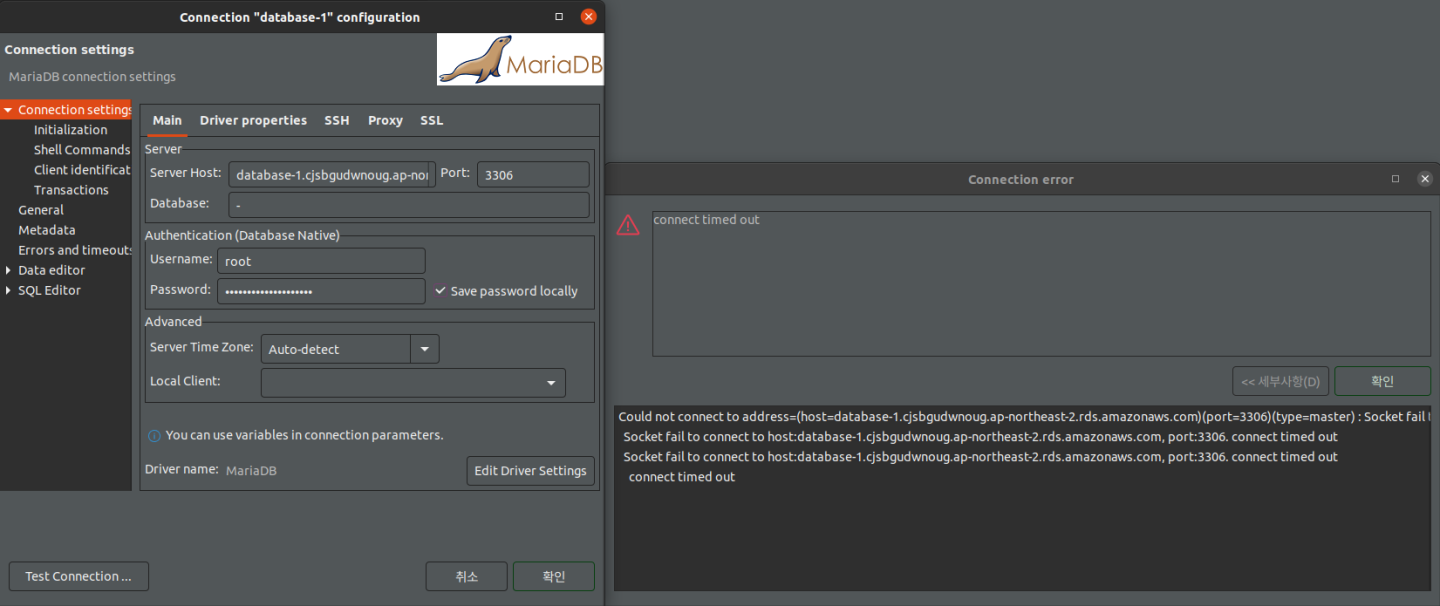 디비버에 필요한 정보들(Server Host - 엔드포인트, Port, Database - DB 이름, Username - root, Password - 암호 자동 생성으로 저장해둔 것)을 정확히 입력했는데도 안돼서,