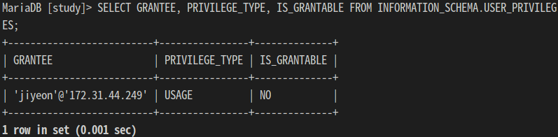 GRANT ALL PRIVILEGES ON study.* TO jiyeon@172.31.44.249;