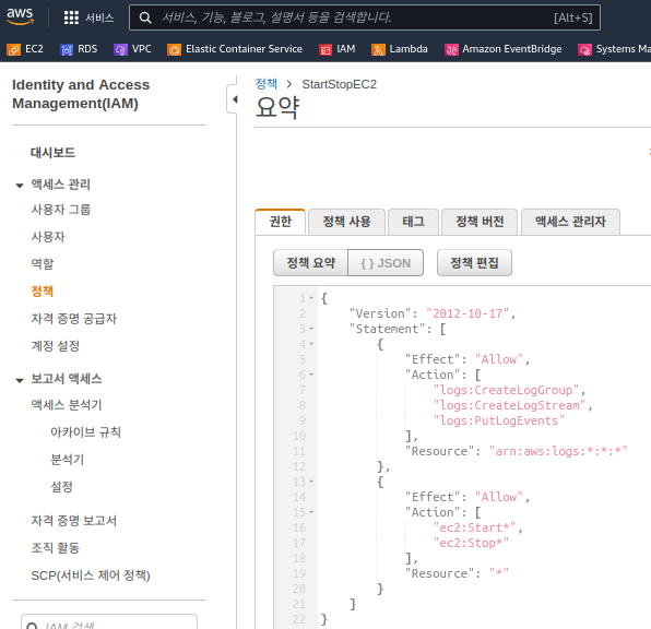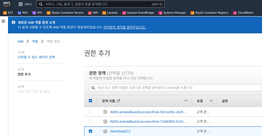 권한 정책: 방금 생성한 IAM 정책(필자의 경우 'StartStopEC2')