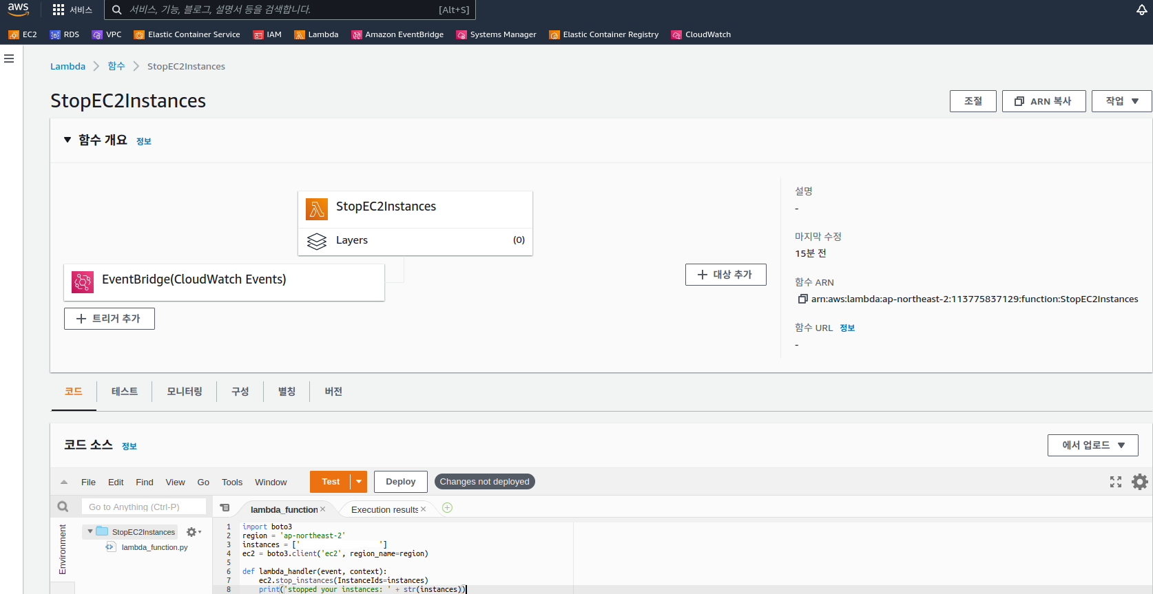 - 코드(Code)의 코드 소스(Code source)에서 다음 코드(EC2 인스턴스 중지)를 복사하여 코드 편집기의 편집기 창에 붙여 넣기