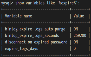 show variables like '%expire%'; -- 보관주기(expire_logs_days) 확인