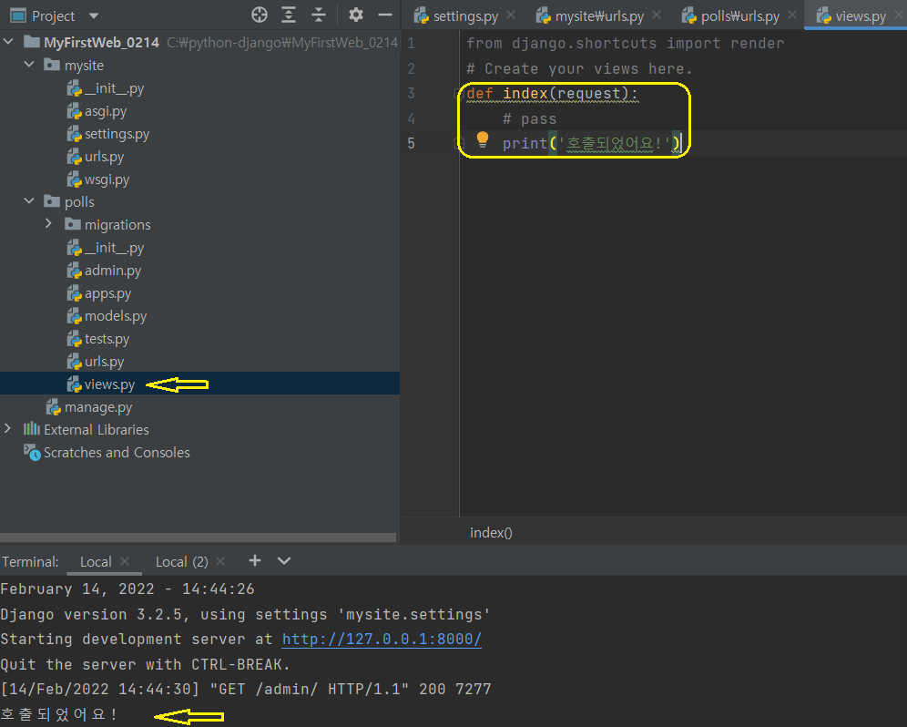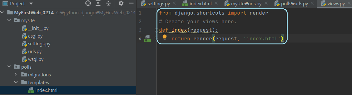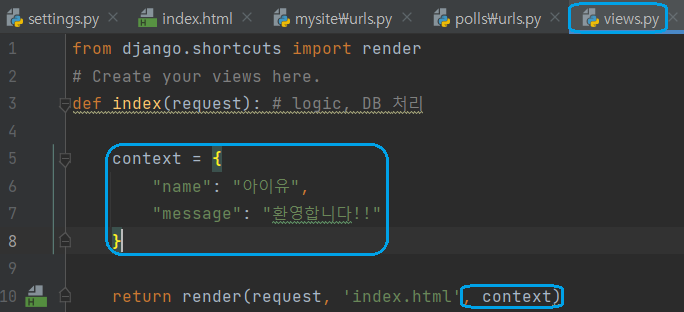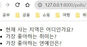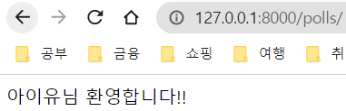 9. polls App에 해당되는 URL로 진입(request)하면 view로 index함수가 호출되므로 이를 정의해야 함