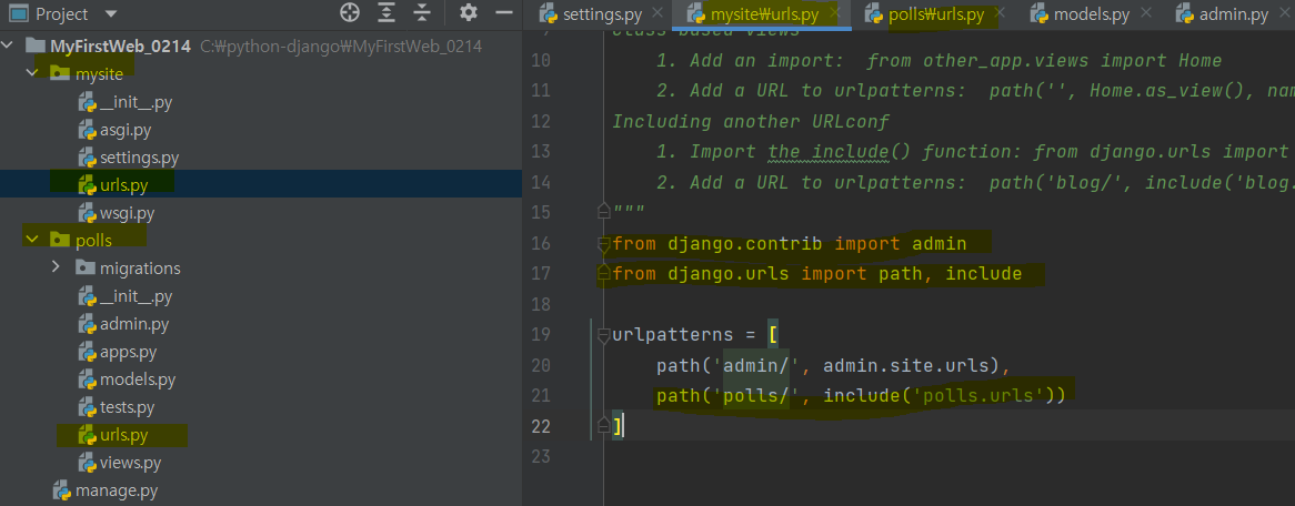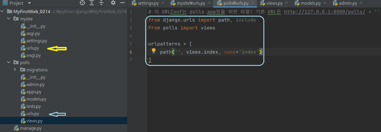 mysite 폴더 안의 urls.py(Root URLConf)에 polls App에 대한 URLConf의 경로를 설정함