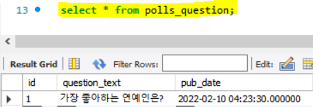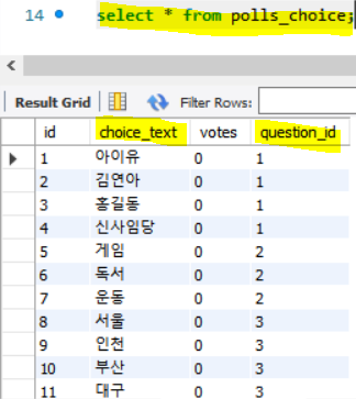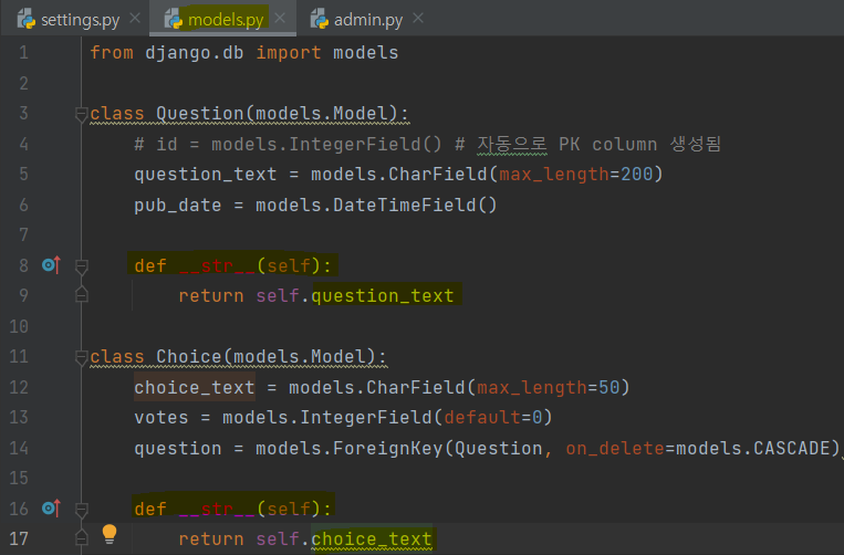 5. Python 객체는 문자열이 아니므로 매직 펑션(def __str__(self): return self.~_text)을 사용해야 어드민 페이지에서 질문을 확인할 수 있음