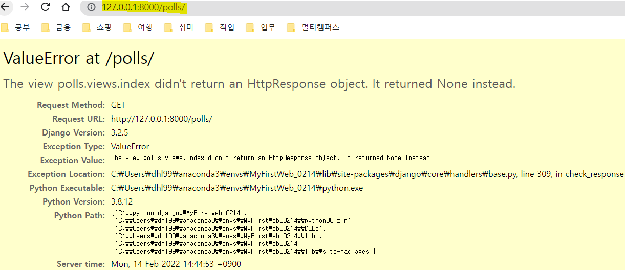 아직 URLConf, View만 설정했기에 Server polls page로 들어가면, Template(response가 none)이 없어 오류창이 뜸