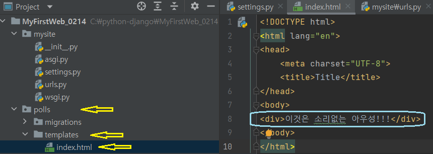 11. polls 폴더 안에 templates라는 신규 폴더를 생성하고, 그 안에 index라는 HTML 파일을 만들어줌