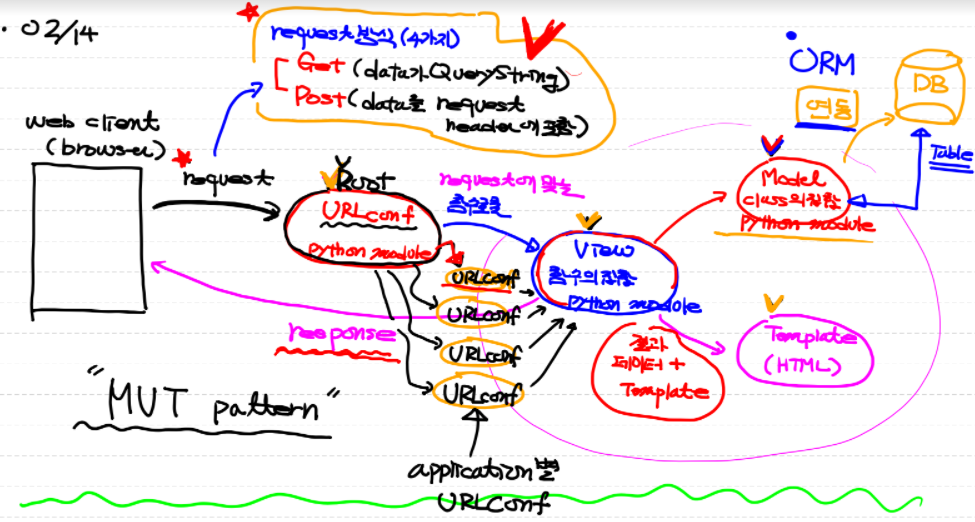 7. Root URLConf 안에서 모든 URL을 다 처리할 수 없기 때문에, 각 application에 대한 URL을 배정해줘야 함↓
