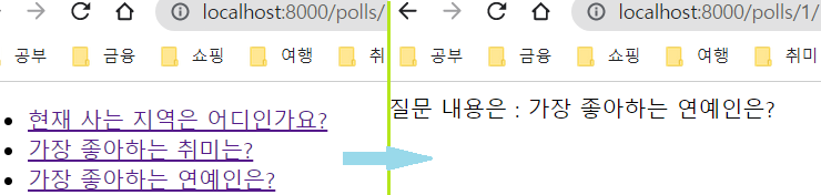 6. polls page에서 문제를 클릭면 해당하는 question_id(PK)에 따라 질문의 내용을 출력함