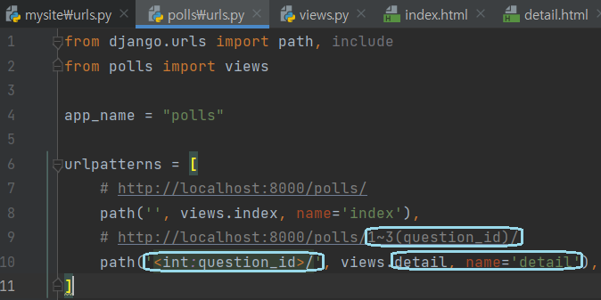 3. urls.py(polls URLConf) 파일에서 question_id에 대한 URLConf의 경로를 설정해야 함