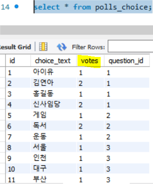 하지만 MySQL에서 poll_choice를 조회해보면, votes의 숫자가 추가된 것을 알 수 있음