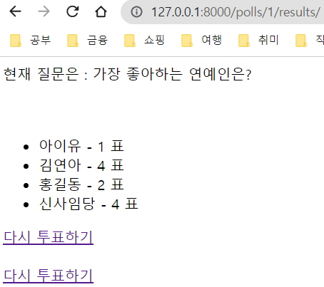 <li>{{ choice.choice_text }} - {{ choice.votes }} 표</li>