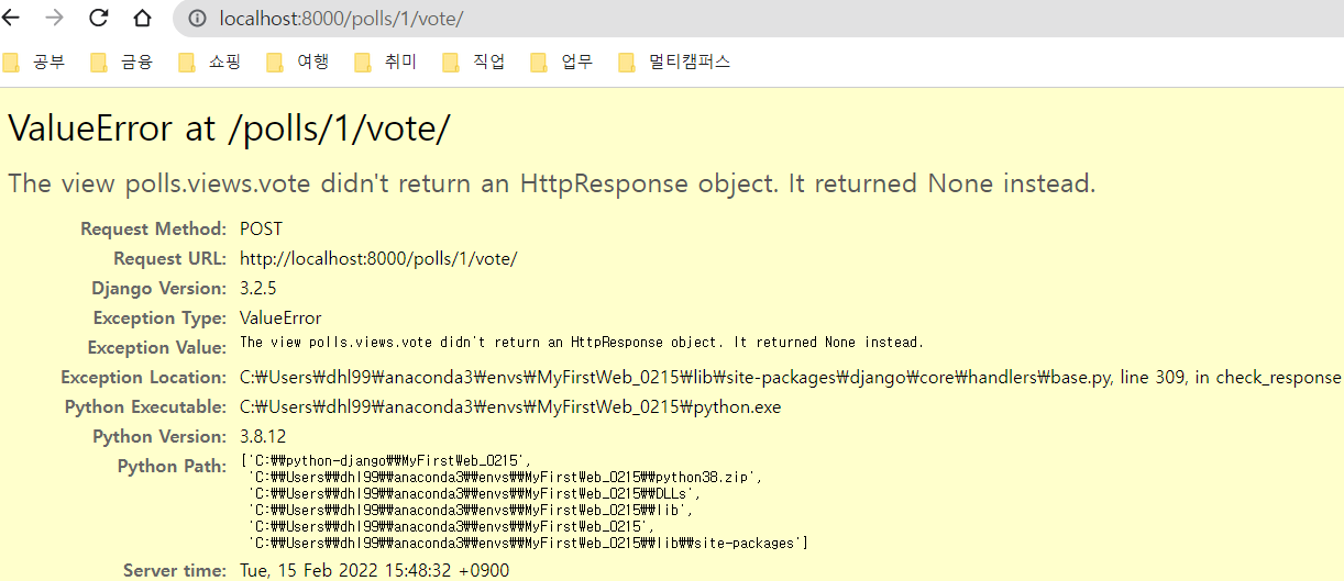 아직 URLConf, View만 설정했기에 Server polls page로 들어가면, Template(response가 none)이 없어 오류창이 뜸