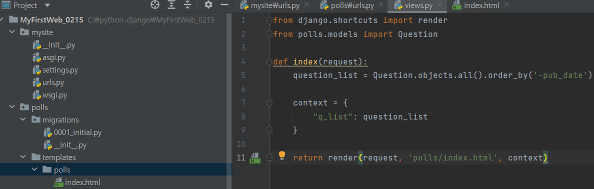 1. 오늘은 templates 폴더 안에 추가로 polls 폴더를 만들고 index.html 파일을 생성해줌