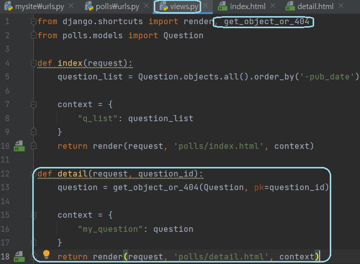 4. polls App에 해당되는 URL로 진입(request)하면 view로 detail함수가 호출되므로 이를 정의해야 함