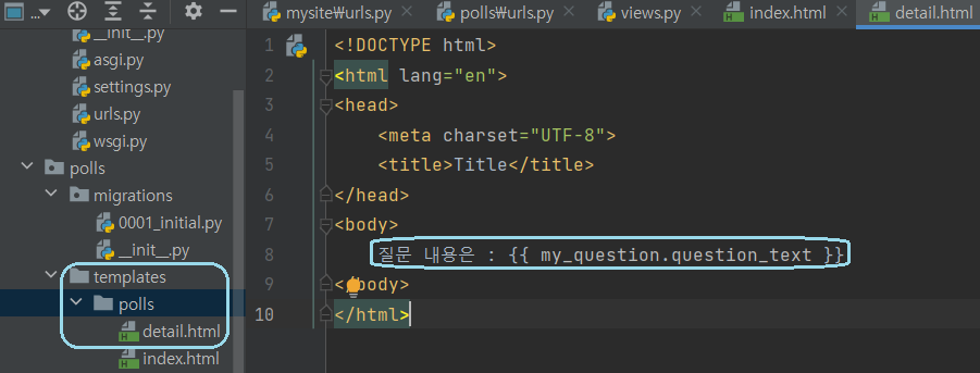 5. templates/polls 폴더 안에 detail라는 HTML 파일을 만들어줌