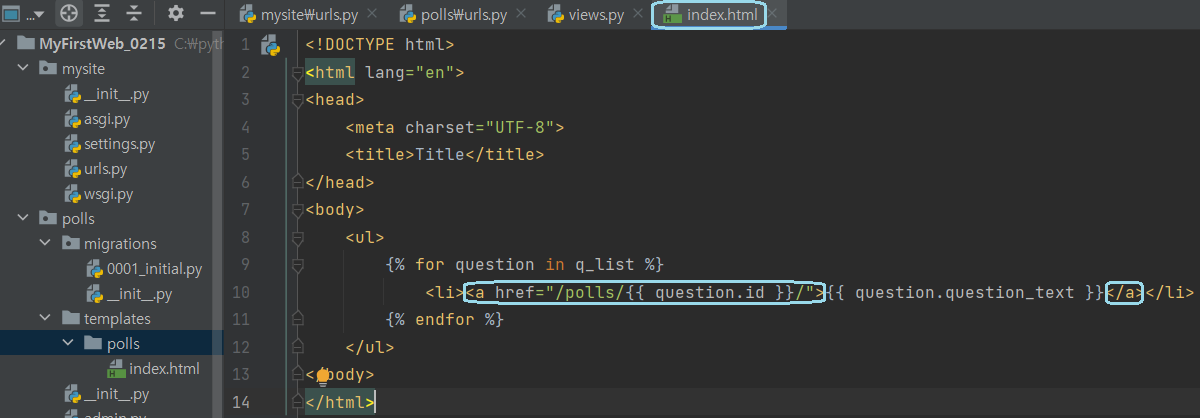앵커 <a href="">로 polls page의 URL을 직접 지정할 수 있지만 URL이 바뀔 가능성이 있으므로(유지보수 위해), urls.py(polls URLConf) 파일에서 지정한 namespace와 Template Tag를 사용해 연결하는 것이 좋음