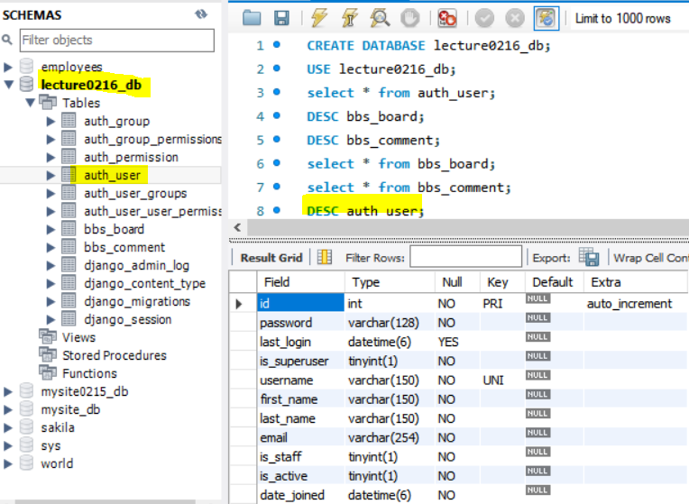 2. MySQL에서 auth_user의 DESC 보기. username이 id