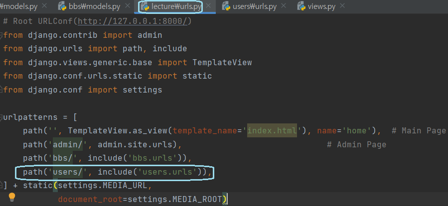 5. Root_URL에 users app 경로 넣어주고, bbs/urls.py을 users 폴더 안에 복붙 하기