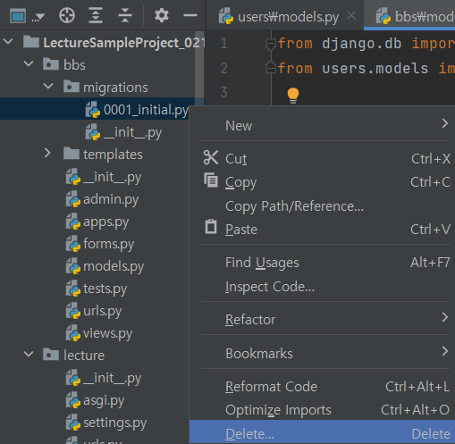 PyCharm에서 기존의 DB Table 명세서 지우기