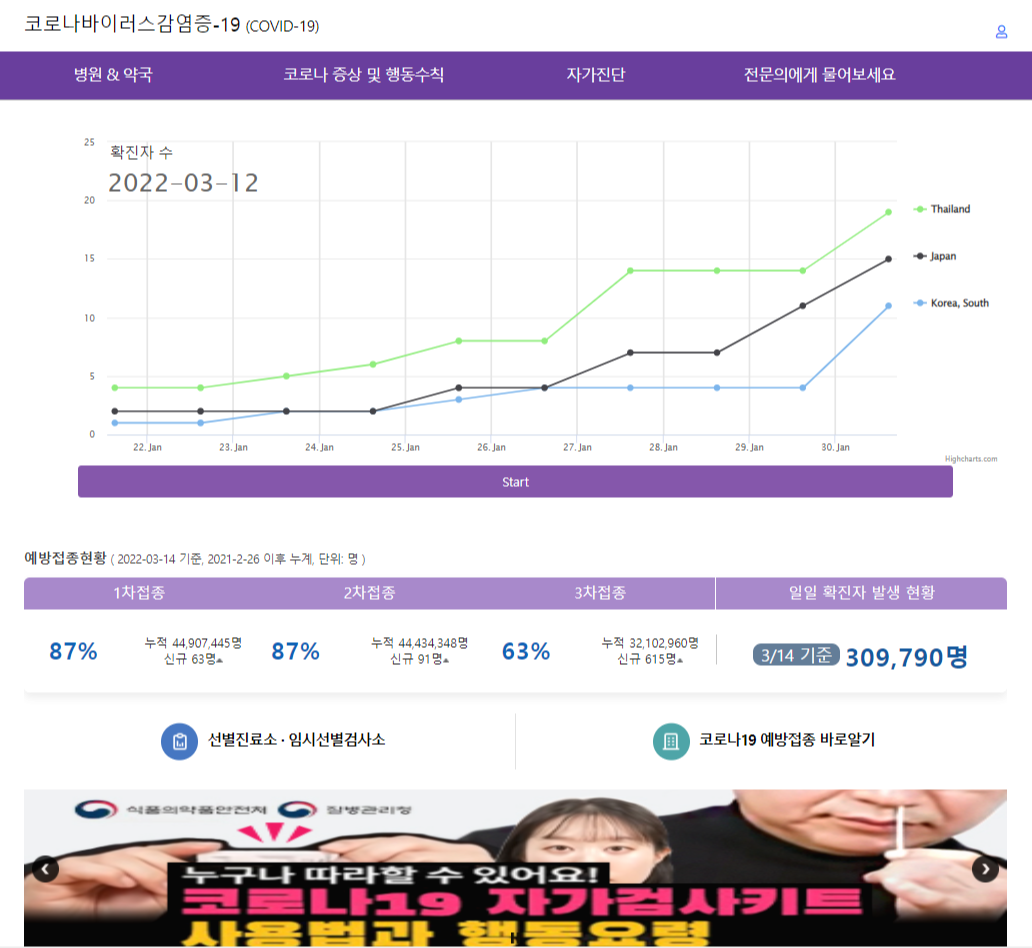 메인 화면의 예방접종 및 일일 확진자 발생 현황(Open API), 자가진단 페이지 구현이다.