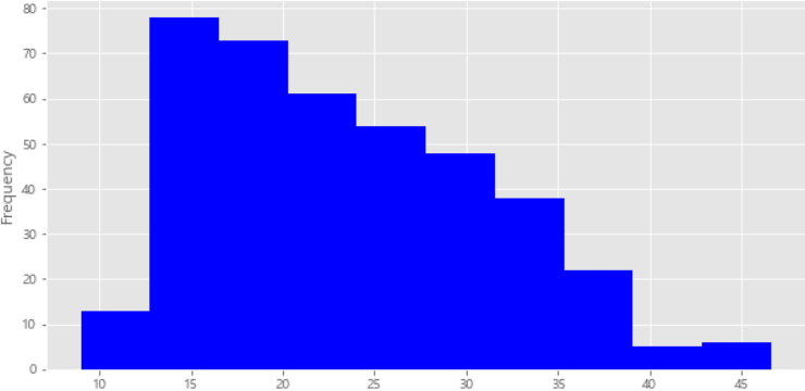 df['mpg'].plot(kind='hist', bins=10, color='blue', figsize=(10,5)) # kind=차트의 종류. bins=구간