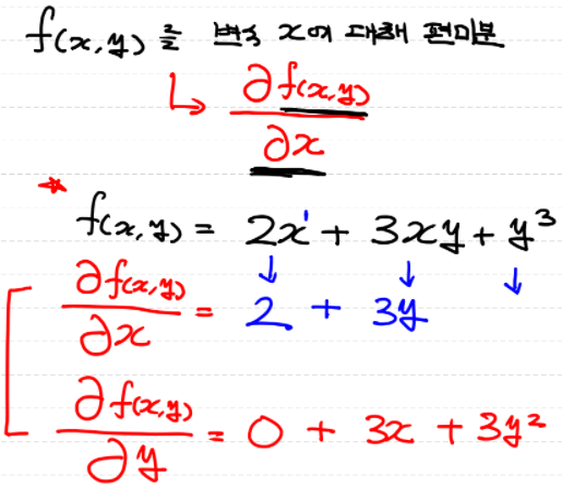 3. 편미분(partial derivative) : 독립변수 두 개 이상인 다변수 함수에서, 미분하고자 하는 변수 하나를 제외한 나머지 변수를 상수(변수에 대하여 항상 일정한 값을 취하는 양)로 취급해서 해당 변수를 미분하는 방법