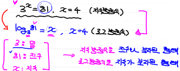 지수방정식은 진수와 분리된 형태, 로그 방정식은 지수가 분리된 형태