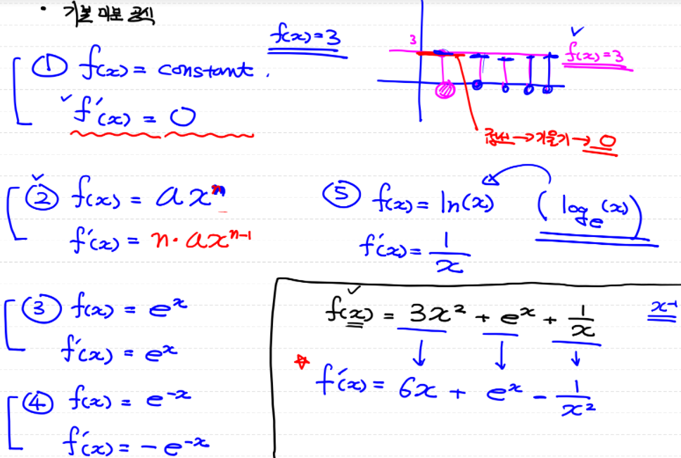 3. 편미분(partial derivative) : 독립변수 두 개 이상인 다변수 함수에서, 미분하고자 하는 변수 하나를 제외한 나머지 변수를 상수(변수에 대하여 항상 일정한 값을 취하는 양)로 취급해서 해당 변수를 미분하는 방법