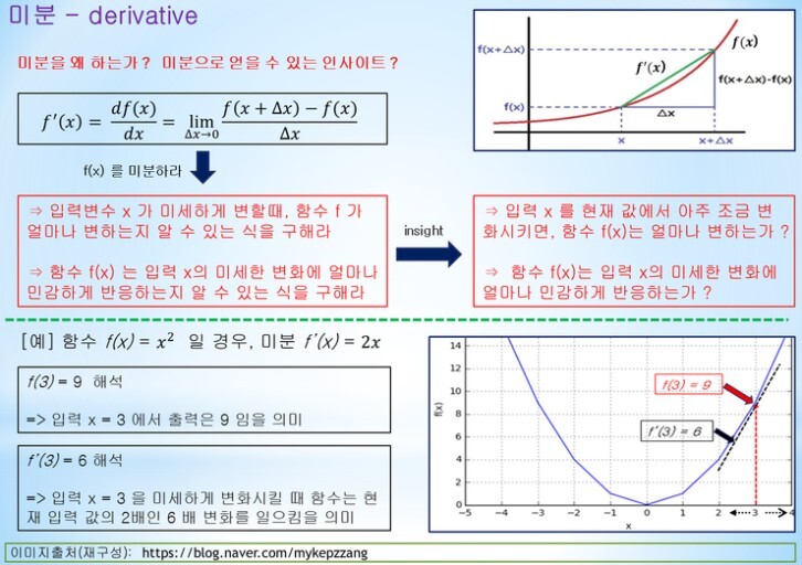 2. 미분 : 어떤 함수의 정의역(두 변수 x, y 사이에 y가 x의 함수로 나타내어질 때에, x가 취할 수 있는 값의 범위) 속 각 점에서 독립변수 값의 변화량과 함수값의 변화량의 비율(직선의 기울기)의 극한, 극한의 집합을 치역(함수가 취하는 값 전체의 집합)으로 가지는 새로운 함수