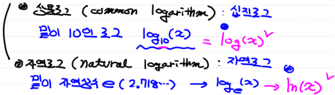 자연로그(natural lodarithm) : 자연로그, 밑이 자연상수 e(2.718...)