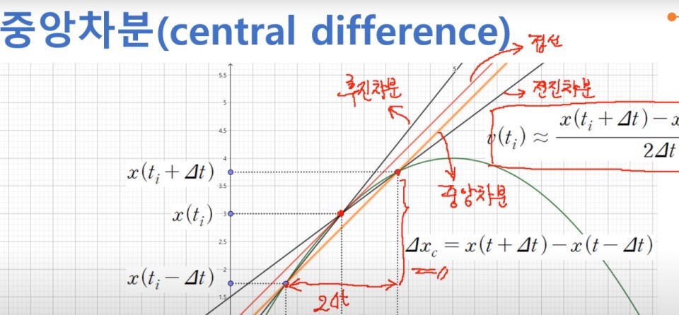 수치미분은 전향차분, 후향차분, 중앙차분(가장 값이 정확)이 있음