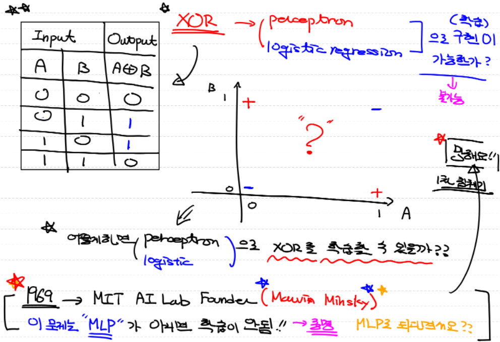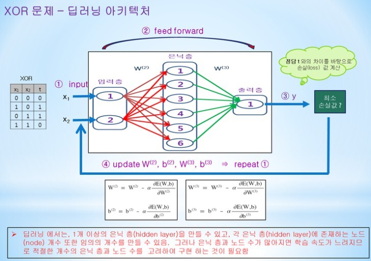 feed forward(propagation). XOR 문제는 node 한 개(perceptron)로는 학습이 안 됨