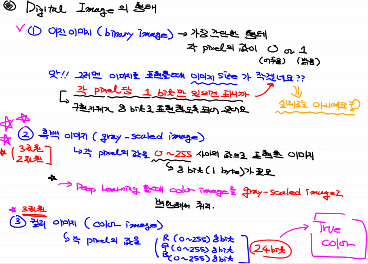 - Computer Vision : 컴퓨터가 이미지나 비디오를 보고 여러 객체를 식별하고 파악할 수 있도록 지원하는 Computer Science 분야. 대표적인 알고리즘은 CNN. 목적은 pixel을 이해하는 방법을 고안하는 것