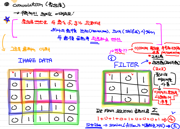 Convolution(합성곱) : 두 함수 f, g가 있을때 하나의 함수를 반전(reverse), 전이(shift)시켜서 두 함수를 곱한 후 적분하는 연산