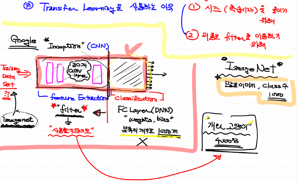 이에 학습해야 하는 데이터를 Pretrained Network(사전 훈련된 네트워크)에 전달해서 학습 시간을 줄이고 더 좋은 filter를 이용하는 방법을 Transfer Learning(전이학습)이라 함